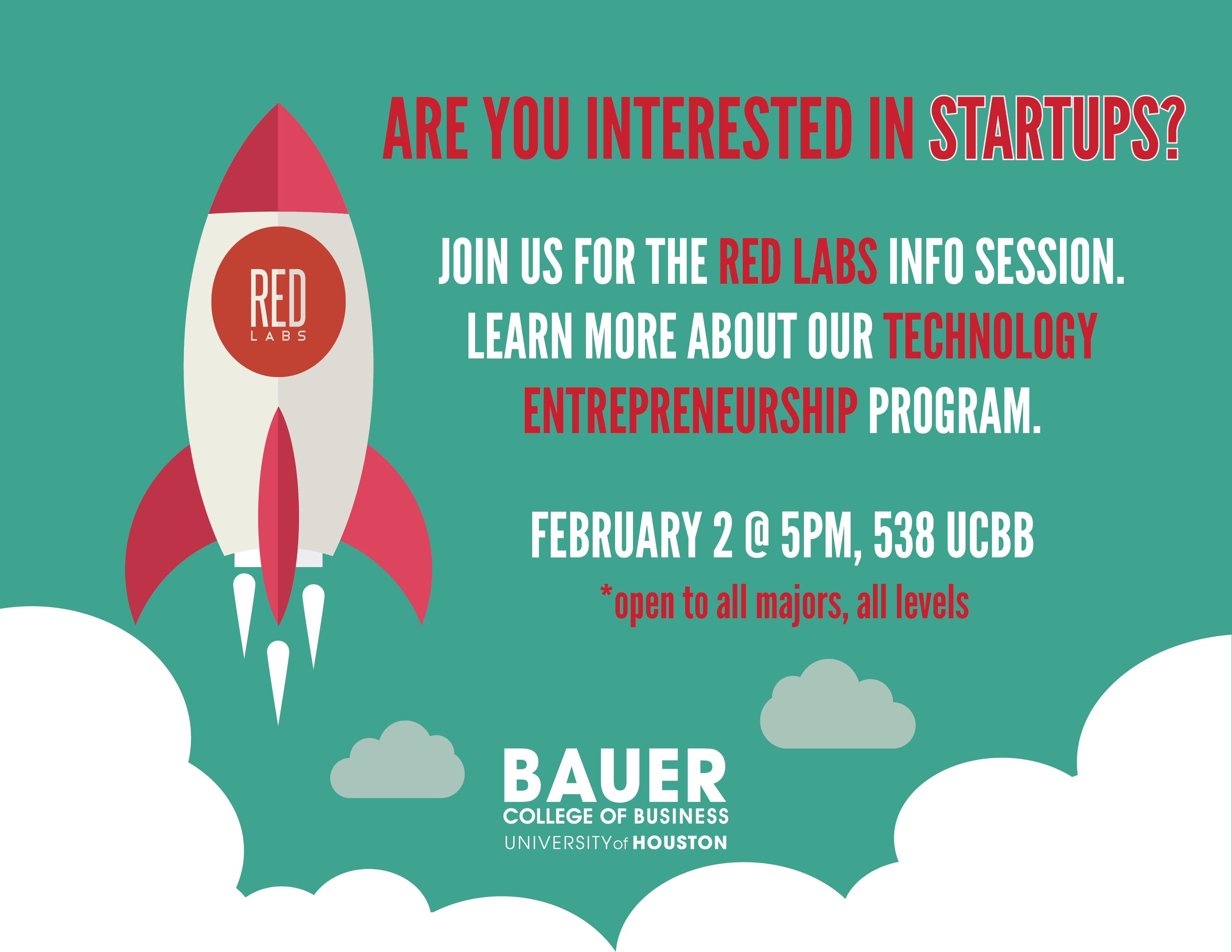 Are you interested in using your skills to build products? Do you want to learn about startups? Find out more about the resources available to you through RED Labs, the University of Houston's startup accelerator and technology entrepreneurship program. Join us for an information session on Thursday, March 23rd at 5pm in the UCBB, room 310. If you already know you're interested, the application deadline for our summer accelerator program is March 31st at midnight.