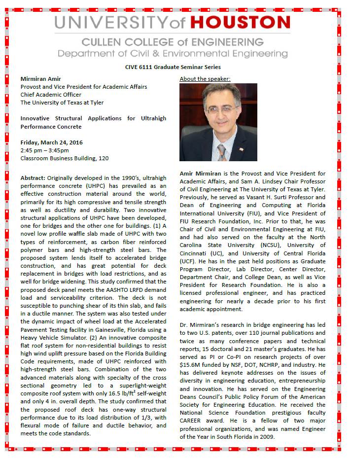 The Civil and Environmental Engineering CIVE 6111 Graduate Seminar by Dr. Amir Mirmiran will be this Friday, March 24th from 2:30PM-4:00PM. Light refreshments and set-up will be from 2:30-2:45PM. The talk will be held from 2:45PM-3:45PM in the Classroom Business Building (CBB) Room 120.