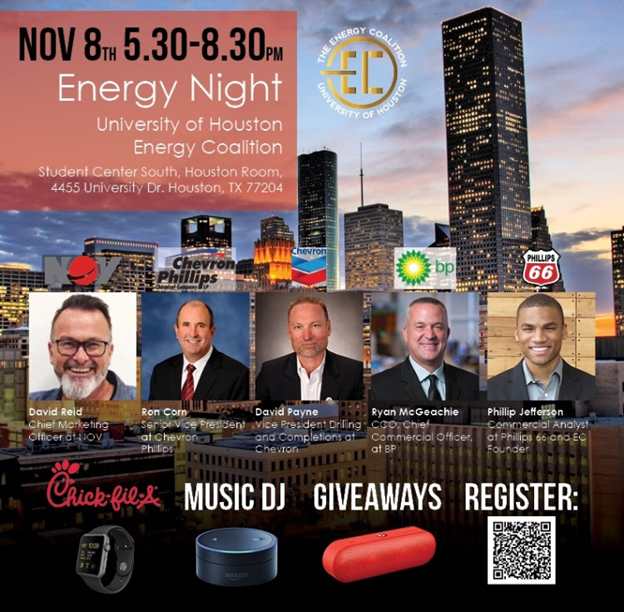 Students will have the opportunity to learn about the Energy Coalition, the University of Houston, the city of Houston itself and how all three tie together to create the Energy Capital of the World. We will be hosting various speakers from different sectors of the energy industry including David Reid- Chief Marketing Officer at NOV, Ron Corn- Senior VP at Chevron Phillips, David Payne- VP Drilling and Completions at Chevron and more! Don't miss out on your opportunity to win some great prizes, let us and your friends know you're going.
