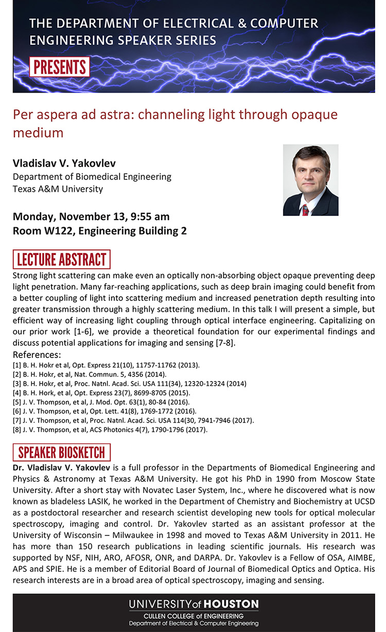 [CCoE Notice] ECE Speaker Series Presents: Per aspera ad astra: channeling light through opaque medium (Vladislav V. Yakovlev)