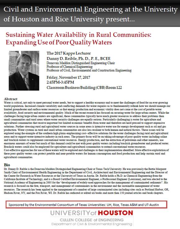 This week's CIVE 6111 Graduate Seminar speaker and the 2017 Kappe Lecturer is Dr. Danny Reible. Dr. Reible will give his seminar on Sustaining Water Availability in Rural Communities: Expanding Use of Poor Quality Waters this Friday, November 17th from 2:30PM-4:00PM. We will serve light refreshments and set-up from 2:30-2:45PM. The talk will be held from 2:45PM-3:45PM in the Classroom Business Building (CBB) Room 122.