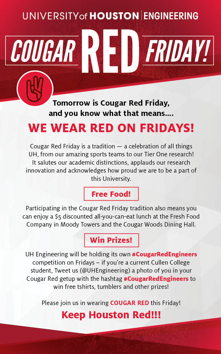 Tweet us (@UHEngineering) a photo of your Cougar Red outfit tomorrow with the hashtag #CougarRedEngineers to win a prize!!