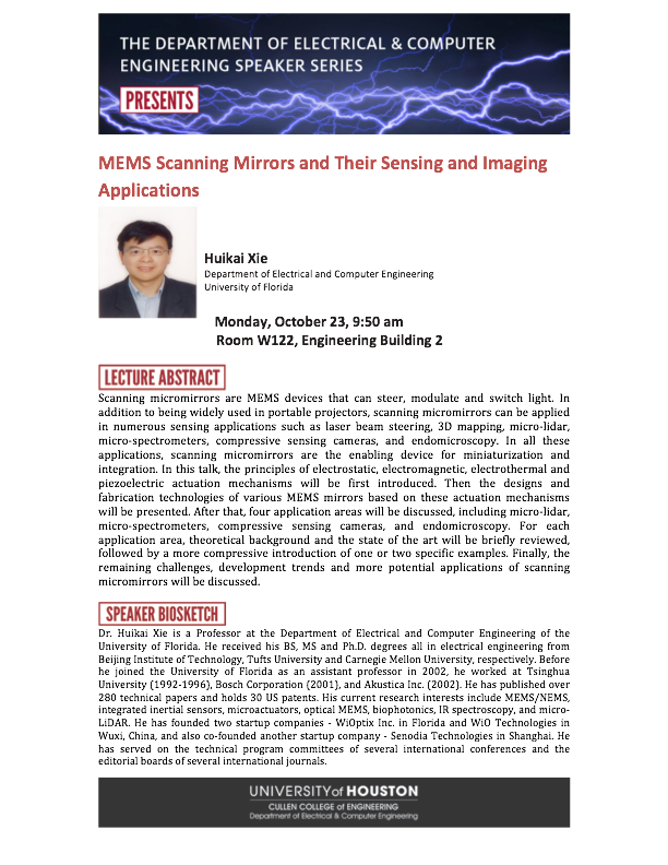 [CCoE Notice] ECE Speaker Series Presents: MEMS Scanning Mirrors and Their Sensing and Imaging Applications (Huikai Xie)