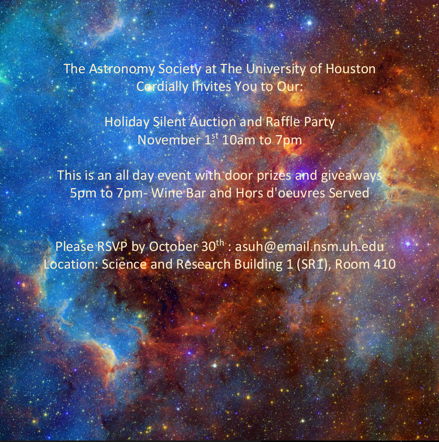 The Astronomy Society @UH invites you to our Holiday Silent Auction and Raffle Party on Wednesday November 1st! ASUH was created to provide an environment for our UH community and neighbors to learn about the sun, moon, stars, planets, comets, galaxies, gas, dust and other non-Earthly bodies and phenomena. We are building a robust outreach experience for our community and strive to offer a higher quality observational experience that would come from an expansion of our equipment inventory. In the process, our aim is to be a valuable resource, providing another opportunity to strengthen our UH community and attract future Coogs!
