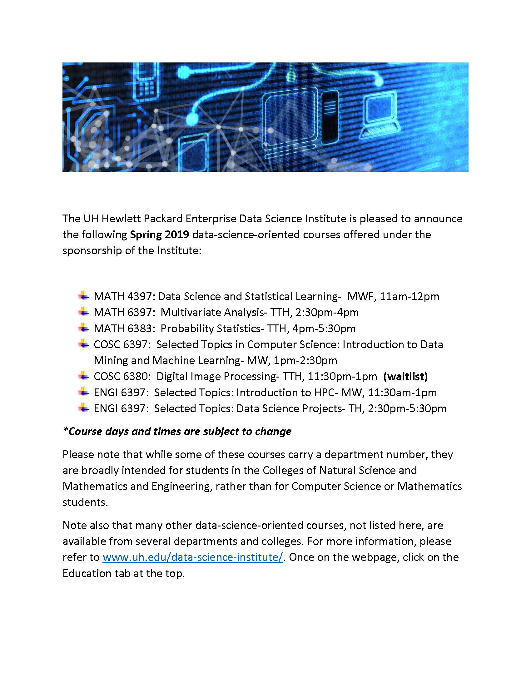 The HPE Data Science Institute is sponsoring the offering of several courses (both graduate and undergraduate) next semester. Please see flyer below or visit www.uh.edu/data-science-institute for more information!