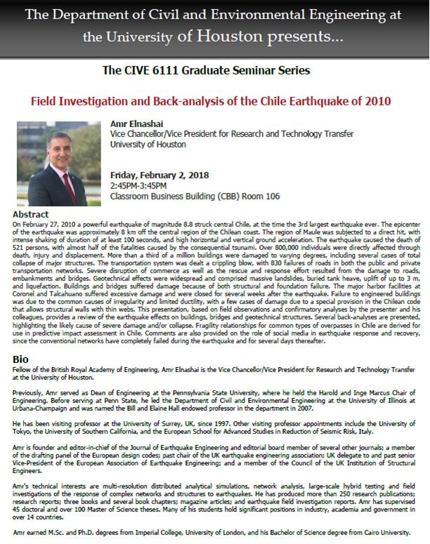 [CCoE Notice] CIVE 6111 Graduate Seminar-Dr. Amr Elnashai -Friday, February 2nd from 2:30PM-4:00PM-CBB Room 106