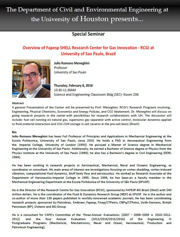 You are invited to attend a special seminar by Dr. Julio Romano Meneghini this Thursday, February 8th from 10:30AM-11:30AM in Science and Engineering Classroom Building (SEC)- Room 206. Please see the announcement below.