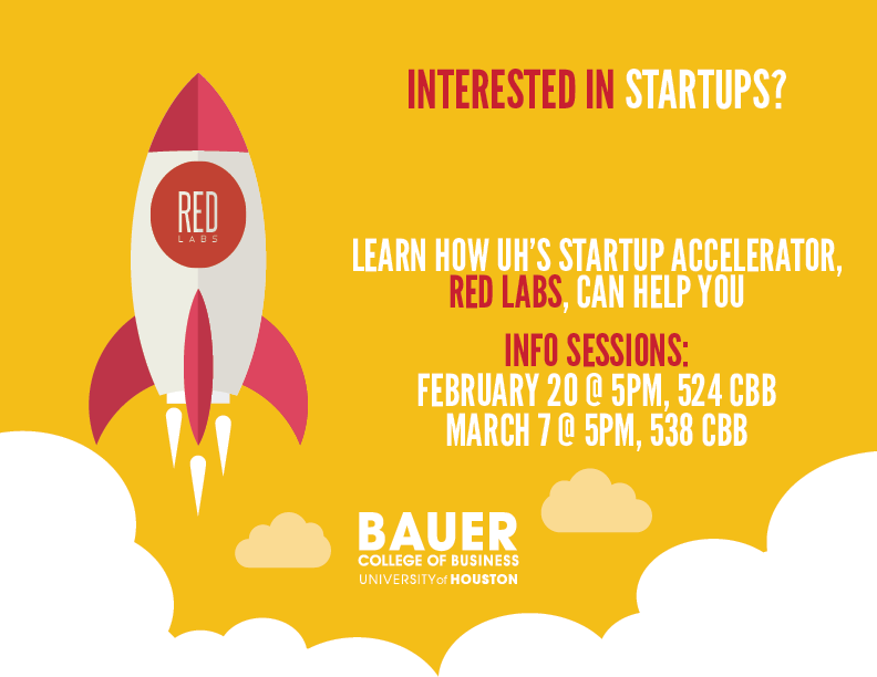 RED Labs, the University of Houston's startup accelerator and technology entrepreneurship program, helps students and faculty members learn how to build a startup around technology and innovative ideas. Find out more about how RED Labs can help you at one of our info sessions on Tuesday, February 20 at 5pm in the CBB, room 524 or Wednesday, March 7 at 5pm in the CBB, room 538.