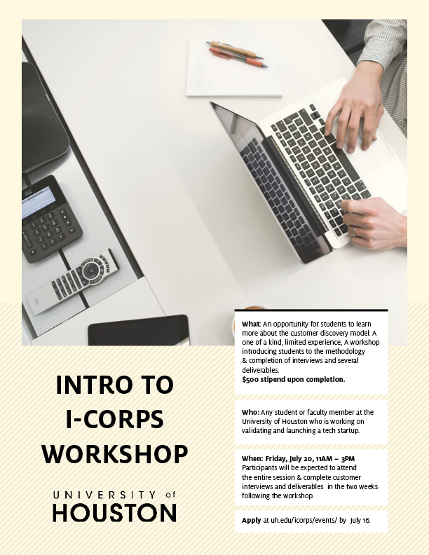 The summer Intro to I-Corps Workshop application is now open to all UH students and faculty from any major, level, or college. You simply need a tech startup idea. Participants will learn about the process of launching a startup including: how to find the right customer, bringing value to your customer, and how to handle intellectual property.