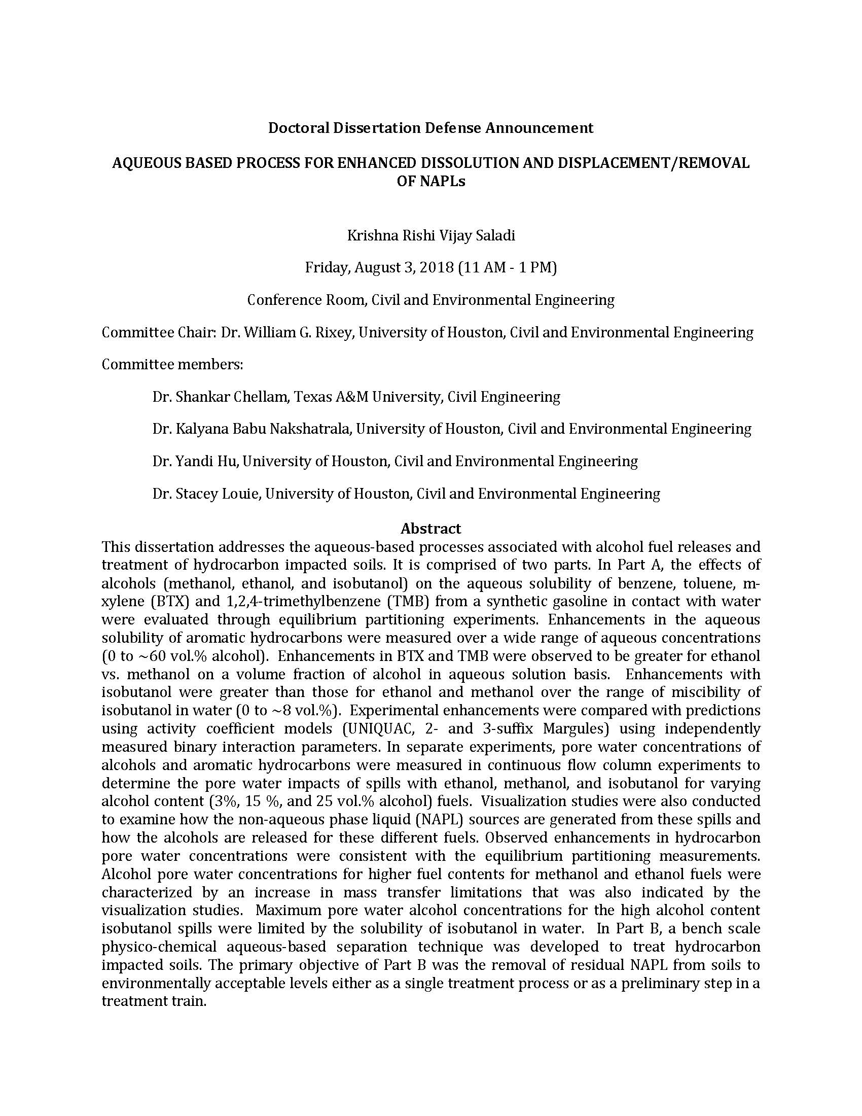 [CCoE Notice] Thesis Defense: Aqueous Based Process for Enhanced Dissolution and Displacement/Removal of NAPLs