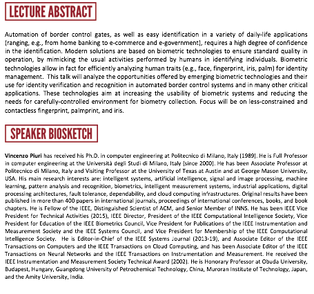 [Text Box: Automation of border control gates, as well as easy identification in a variety of daily-life applications (ranging, e.g., from home banking to e-commerce and e-government), requires a high degree of confidence in the identification. Modern solutions are based on biometric technologies to ensure standard quality in operation, by mimicking the usual activities performed by humans in identifying individuals. Biometric technologies allow in fact for efficiently analyzing human traits (e.g., face, fingerprint, iris, palm) for identity management. This talk will analyze the opportunities offered by emerging biometric technologies and their use for identity verification and recognition in automated border control systems and in many other critical applications. These technologies aim at increasing the usability of biometric systems and reducing the needs for carefully-controlled environment for biometry collection. Focus will be on less-constrained and contactless fingerprint, palmprint, and iris. Vincenzo Piuri has received his Ph.D. in computer engineering at Politecnico di Milano, Italy (1989). He is Full Professor in computer engineering at the Universit? degli Studi di Milano, Italy (since 2000). He has been Associate Professor at Politecnico di Milano, Italy and Visiting Professor at the University of Texas at Austin and at George Mason University, USA. His main research interests are: intelligent systems, artificial intelligence, signal and image processing, machine learning, pattern analysis and recognition, biometrics, intelligent measurement systems, industrial applications, digital processing architectures, fault tolerance, dependability, and cloud computing infrastructures. Original results have been published in more than 400 papers in international journals, proceedings of international conferences, books, and book chapters. He is Fellow of the IEEE, Distinguished Scientist of ACM, and Senior Member of INNS. He has been IEEE Vice President for Technical Activities (2015), IEEE Director, President of the IEEE Computational Intelligence Society, Vice President for Education of the IEEE Biometrics Council, Vice President for Publications of the IEEE Instrumentation and Measurement Society and the IEEE Systems Council, and Vice President for Membership of the IEEE Computational Intelligence Society. He is Editor-in-Chief of the IEEE Systems Journal (2013-19), and Associate Editor of the IEEE Transactions on Computers and the IEEE Transactions on Cloud Computing, and has been Associate Editor of the IEEE Transactions on Neural Networks and the IEEE Transactions on Instrumentation and Measurement. He received the IEEE Instrumentation and Measurement Society Technical Award (2002). He is Honorary Professor at Obuda University, Budapest, Hungary, Guangdong University of Petrochemical Technology, China, Muroran Institute of Technology, Japan, and the Amity University, India.]
