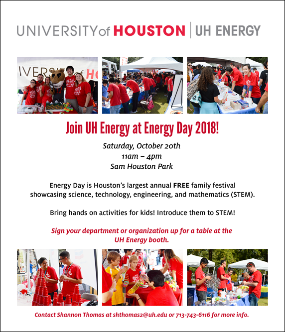Please see the attached flyer about Energy Day 2018 on Saturday, October 20th. We have 10 tables available. Faculty, staff, students, student orgs, etc are all welcome to participate. Lunch will be provided for all volunteers.