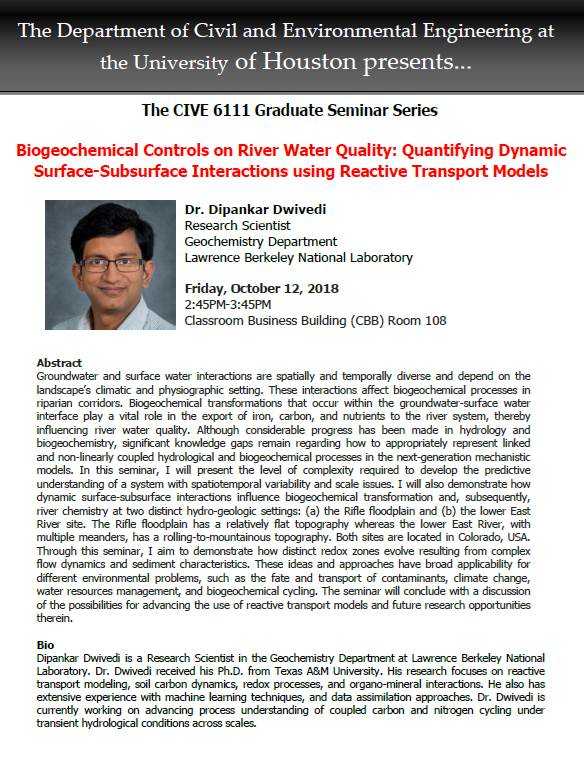 You are invited to attend the Civil & Environmental Engineering CIVE 6111 Graduate Seminar titled Biogeochemical Controls on River Water Quality: Quantifying Dynamic Surface-Subsurface Interactions using Reactive Transport Models by Dr. Dipankar Dwivedi this Friday, October 12th from 2:30PM-4:00PM. We will serve light refreshments and set-up from 2:30-2:45PM. The talk will be held from 2:45PM-3:45PM in the Classroom Business Building (CBB) Room 108.