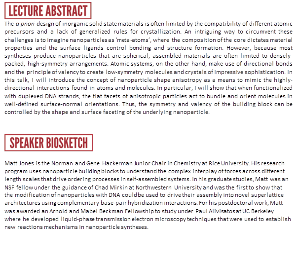 [The a priori design of inorganic solid state materials is often limited by the compatibility of different atomic precursors and a lack of generalized rules for crystallization. An intriguing way to circumvent these challenges is to imagine nanoparticles as 'meta-atoms', where the composition of the core dictates material properties and the surface ligands control bonding and structure formation. However, because most syntheses produce nanoparticles that are spherical, assembled materials are often limited to densely-packed, high-symmetry arrangements. Atomic systems, on the other hand, make use of directional bonds and the principle of valency to create low-symmetry molecules and crystals of impressive sophistication. In this talk, I will introduce the concept of nanoparticle shape anisotropy as a means to mimic the highly-directional interactions found in atoms and molecules. In particular, I will show that when functionalized with duplexed DNA strands, the flat facets of anisotropic particles act to bundle and orient molecules in well-defined surface-normal orientations. Thus, the symmetry and valency of the building block can be controlled by the shape and surface faceting of the underlying nanoparticle. Matt Jones is the Norman and Gene Hackerman Junior Chair in Chemistry at Rice University. His research program uses nanoparticle building blocks to understand the complex interplay of forces across different length scales that drive ordering processes in self-assembled systems. In his graduate studies, Matt was an NSF fellow under the guidance of Chad Mirkin at Northwestern University and was the first to show that the modification of nanoparticles with DNA could be used to drive their assembly into novel superlattice architectures using complementary base-pair hybridization interactions. For his postdoctoral work, Matt was awarded an Arnold and Mabel Beckman Fellowship to study under Paul Alivisatos at UC Berkeley where he developed liquid-phase transmission electron microscopy techniques that were used to establish new reactions mechanisms in nanoparticle syntheses.]