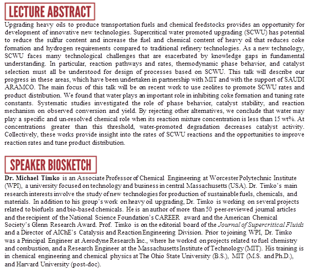 [Upgrading heavy oils to produce transportation fuels and chemical feedstocks provides an opportunity for development of innovative new technologies. Supercritical water promoted upgrading (SCWU) has potential to reduce the sulfur content and increase the fuel and chemical content of heavy oil that reduces coke formation and hydrogen requirements compared to traditional refinery technologies. As a new technology, SCWU faces many technological challenges that are exacerbated by knowledge gaps in fundamental understanding. In particular, reaction pathways and rates, thermodynamic phase behavior, and catalyst selection must all be understood for design of processes based on SCWU. This talk will describe our progress in these areas, which have been undertaken in partnership with MIT and with the support of SAUDI ARAMCO. The main focus of this talk will be on recent work to use zeolites to promote SCWU rates and product distribution. We found that water plays an important role in inhibiting coke formation and tuning rate constants. Systematic studies investigated the role of phase behavior, catalyst stability, and reaction mechanism on observed conversion and yield. By rejecting other alternatives, we conclude that water may play a specific and un-resolved chemical role when its reaction mixture concentration is less than 15 wt%. At concentrations greater than this threshold, water-promoted degradation decreases catalyst activity. Collectively, these works provide insight into the rates of SCWU reactions and the opportunities to improve reaction rates and tune product distribution. Dr. Michael Timko is an Associate Professor of Chemical Engineering at Worcester Polytechnic Institute (WPI), a university focused on technology and business in central Massachusetts (USA). Dr. Timko's main research interests involve the study of new technologies for production of sustainable fuels, chemicals, and materials. In addition to his group's work on heavy oil upgrading, Dr. Timko is working on several projects related to biofuels and bio-based chemicals. He is an author of more than 50 peer-reviewed journal articles and the recipient of the National Science Foundation's CAREER award and the American Chemical Society's Glenn Research Award. Prof. Timko is on the editorial board of the Journal of Supercritical Fluids and a Director of AIChE's Catalysis and Reaction Engineering Division. Prior to joining WPI, Dr. Timko was a Principal Engineer at Aerodyne Research Inc., where he worked on projects related to fuel chemistry and combustion, and a Research Engineer at the Massachusetts Institute of Technology (MIT). His training is in chemical engineering and chemical physics at The Ohio State University (B.S.), MIT (M.S. and Ph.D.), and Harvard University (post-doc).]