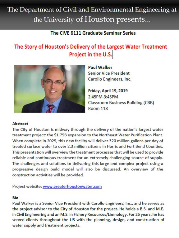 You are invited to attend the Civil & Environmental Engineering CIVE 6111 Graduate Seminar titled The Story of Houston’s Delivery of the Largest Water Treatment Project in the U.S. by Paul Walker tomorrow, Friday, April 19th from 2:30PM-4:00PM. We will serve light refreshments and set-up from 2:30PM-2:45PM. The talk will be held from 2:45PM-3:45PM in the Classroom Business Building (CBB) Room 118.