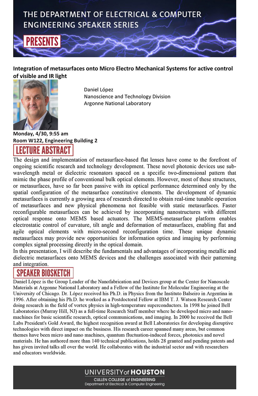 [CCoE Notice] ECE Speaker Series Presents: Integration of metasurfaces onto Micro Electro Mechanical Systems for active control of visible and IR light (4/30)