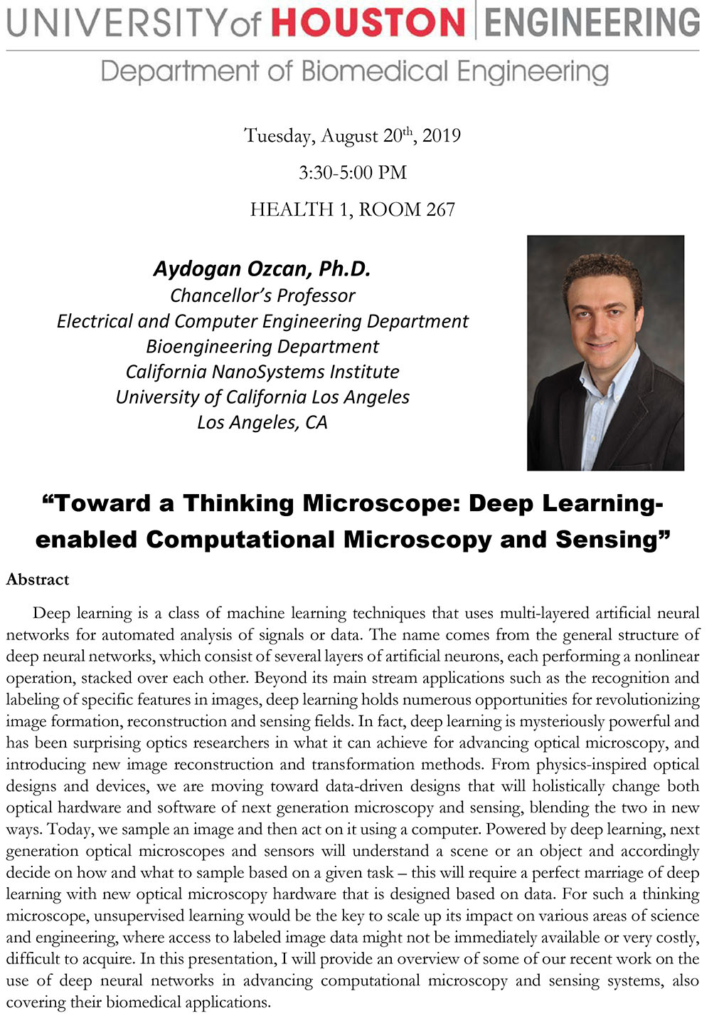 Please join us as Dr. Ozcan presents his work on “Deep learning-enabled computational microscopy and sensing” next Tuesday, August 20th at 3:30 in Health 1, Room 267.