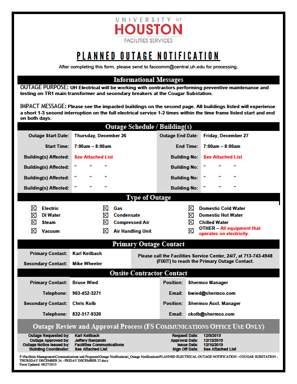 From: Building Coordinator List [mailto:BUILDINGCOORDINATOR at LISTSERV.UH.EDU] On Behalf Of Facilities Communications