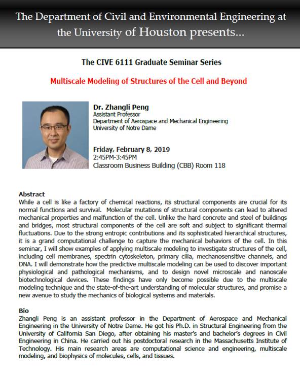 You are invited to attend the Civil & Environmental Engineering CIVE 6111 Graduate Seminar titled Multiscale Modeling of Structures of the Cell and Beyond by Dr. Zhangli Peng this Friday, February 8th from 2:30PM-4:00PM. We will serve light refreshments and set-up from 2:30-2:45PM. The talk will be held from 2:45PM-3:45PM in the Classroom Business Building (CBB) Room 118.