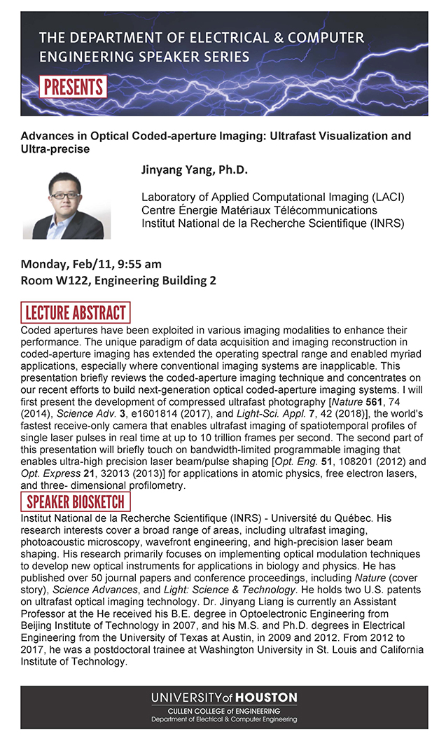 The ECE Speaker Series Presents: Advances in Optical Coded-aperture Imaging: Ultrafast Visualization and Ultra-precise (2/11)