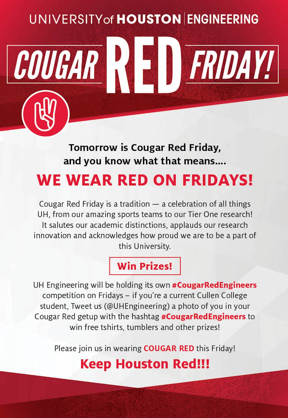 [CCoE Notice] REMINDER- Cougar Red ENGINEERS Friday: Tweet or Share/Post to win a prizes!