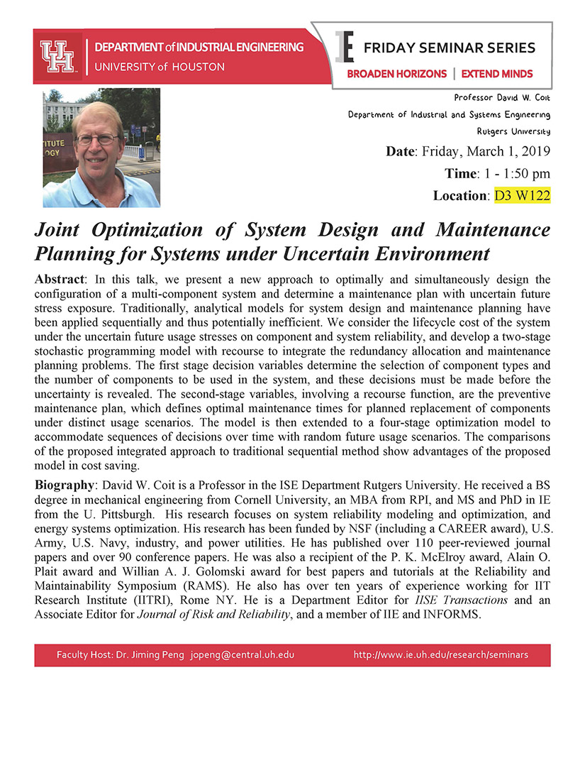 IE Friday Seminar Series: Joint Optimization of System Design and Maintenance Planning for Systems under Uncertain Environment (3/1)