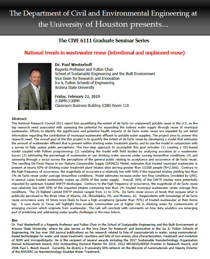 You are invited to attend the Civil & Environmental Engineering CIVE 6111 Graduate Seminar titled National trends in wastewater reuse (intentional and unplanned reuse) by Dr. Paul Westerhoff tomorrow, February 22nd from 2:15PM-3:30PM. We will serve light refreshments and set-up from 2:15-2:30PM. The talk will be held from 2:30PM-3:30PM in the Classroom Business Building (CBB) Room 118.