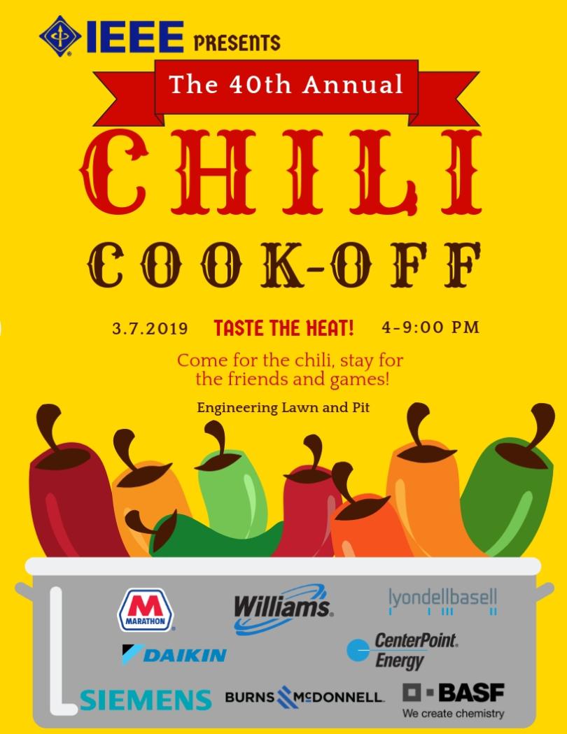 IEEE UH cordially invites you to our 40th IEEE Chili Cook-Off!! This is a long tradition of the college where members of our engineering community come together to relax and socialize. Student organizations and company representatives will compete for the best chili award, and we will have plenty of fun activities for everyone.