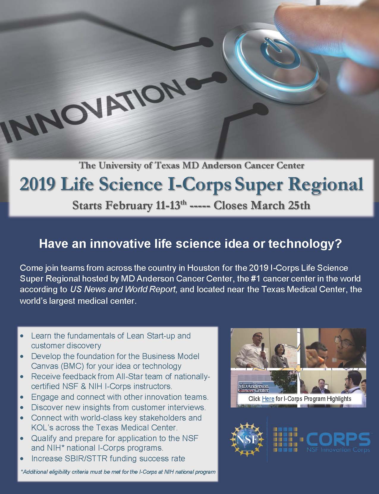 Learn more about NSF I-Corps at MD Anderson. Please see full program flyer attached. The application deadline is February 1st. Johnson & Johnson’s Center for Device Innovation (CDI), TMCx, and JLABS, are involved with the program, and faculty with related background and field of research (bioengineering, biomedical devices, biomaterials, etc.) are encouraged to participate.