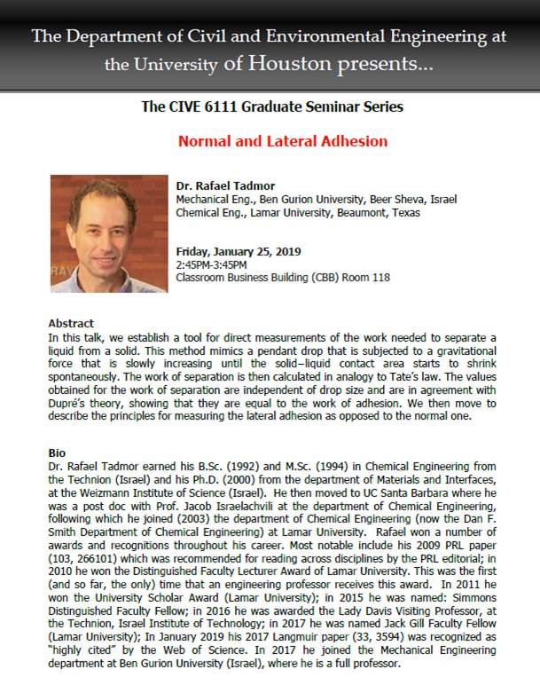 You are invited to attend the Civil & Environmental Engineering CIVE 6111 Graduate Seminar titled Normal and Lateral Adhesion by Dr. Rafael Tadmor tomorrow, Friday, January 25th from 2:30PM-4:00PM. We will serve light refreshments and set-up from 2:30-2:45PM. The talk will be held from 2:45PM-3:45PM in the Classroom Business Building (CBB) Room 118.