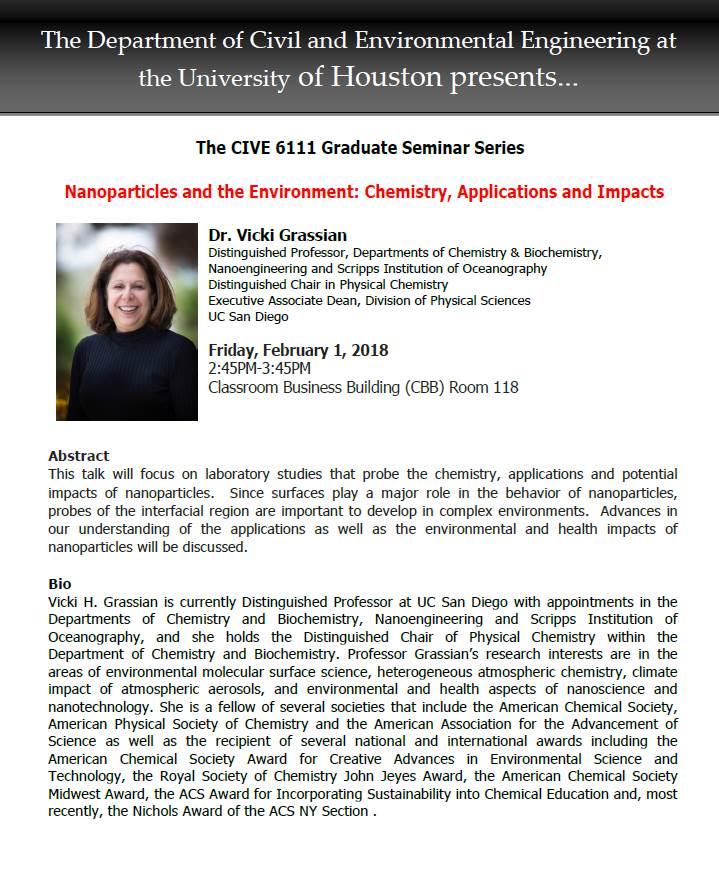 You are invited to attend the Civil & Environmental Engineering CIVE 6111 Graduate Seminar titled Nanoparticles and the Environment: Chemistry, Applications and Impacts by Dr. Vicki Grassian this Friday, February 1st from 2:30PM-4:00PM. We will serve light refreshments and set-up from 2:30-2:45PM. The talk will be held from 2:45PM-3:45PM in the Classroom Business Building (CBB) Room 118.