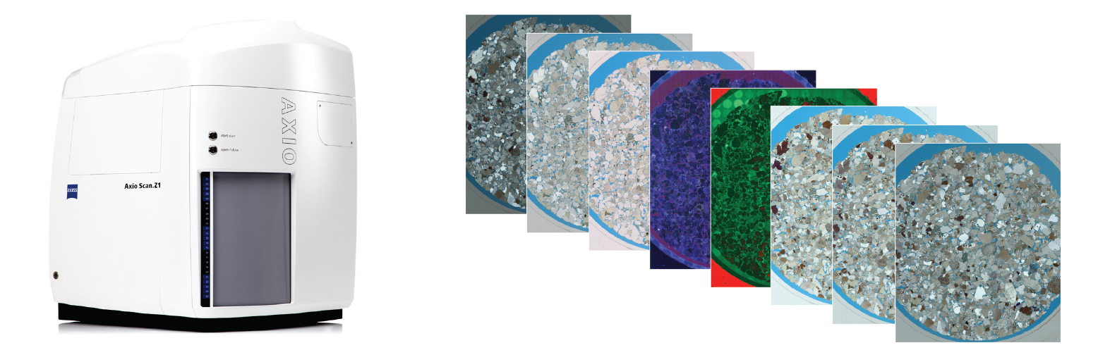 One of the critical challenges in geological microanalysis is that of scale. Local features and structures, when imaged using a single frame, frequently come at the expense of a field of view representative of sample heterogeneity or required to view features in the appropriate geological context. The Axioscan.Z1 allows for high throughput sample digitization allow for entire thin sections to be digitized at high resolution in a matter of minutes in multiple illumination conditions. This for the problem of scale to be effectively dealt with, allowing for much larger structures to be fully characterized without sacrificing resolution. Fully digitized petrographic data presents a range of opportunities for researchers, institutions and students beyond the ability to contextualize local insights. These digitized light microscopy tools can then be coupled with computer vision and machine learning technologies to automatically analyze the rocks to provide detailed insight into geological processes or subsurface reservoir structures.