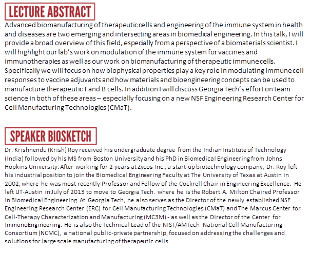[Advanced biomanufacturing of therapeutic cells and engineering of the immune system in health and diseases are two emerging and intersecting areas in biomedical engineering. In this talk, I will provide a broad overview of this field, especially from a perspective of a biomaterials scientist. I will highlight our lab’s work on modulation of the immune system for vaccines and immunotherapies as well as our work on biomanufacturing of therapeutic immune cells. Specifically we will focus on how biophysical properties play a key role in modulating immune cell responses to vaccine adjuvants and how materials and bioengineering concepts can be used to manufacture therapeutic T and B cells. In addition I will discuss Georgia Tech’s effort on team science in both of these areas – especially focusing on a new NSF Engineering Research Center for Cell Manufacturing Technologies (CMaT). Dr. Krishnendu (Krish) Roy received his undergraduate degree from the Indian Institute of Technology (India) followed by his MS from Boston University and his PhD in Biomedical Engineering from Johns Hopkins University. After working for 2 years at Zycos Inc., a start-up biotechnology company, Dr. Roy left his industrial position to join the Biomedical Engineering Faculty at The University of Texas at Austin in 2002, where he was most recently Professor and Fellow of the Cockrell Chair in Engineering Excellence. He left UT-Austin in July of 2013 to move to Georgia Tech. where he is the Robert A. Milton Chaired Professor in Biomedical Engineering. At Georgia Tech, he also serves as the Director of the newly established NSF Engineering Research Center (ERC) for Cell Manufacturing Technologies (CMaT) and The Marcus Center for Cell-Therapy Characterization and Manufacturing (MC3M) - as well as the Director of the Center for ImmunoEngineering. He is also the Technical Lead of the NIST/AMTech National Cell Manufacturing Consortium (NCMC), a national public-private partnership, focused on addressing the challenges and solutions for large scale manufacturing of therapeutic cells.]