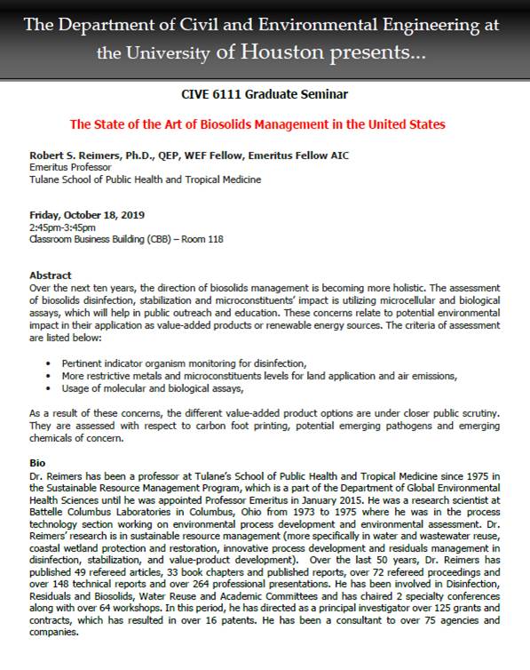 You are invited to attend the Civil & Environmental Engineering CIVE 6111 Graduate Seminar titled The State of the Art of Biosolids Management in the United States by Dr. Robert S. Reimers, this Friday, October 18th from 2:30PM-4:00PM. We will serve light refreshments and set-up from 2:30PM-2:45PM. The talk will be held from 2:45PM-3:45PM and will be followed by a brief 15 minute Q&A session. The seminar will be in the Classroom Business Building (CBB) Room 118.