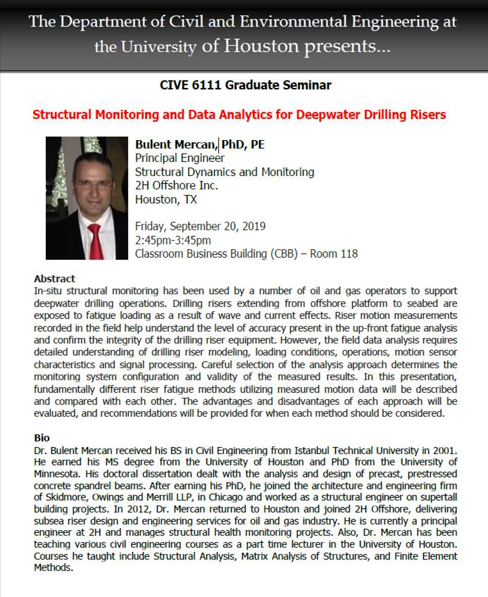 You are invited to attend the Civil & Environmental Engineering CIVE 6111 Graduate Seminar titled Structural Monitoring and Data Analytics for Deepwater Drilling Risers by Dr. Bulent Mercan, this Friday, September 20, 2019 from 2:30PM-4:00PM. We will serve light refreshments and set-up from 2:30PM-2:45PM. The talk will be held from 2:45PM-3:45PM and will be followed by a brief 15 minute Q&A session. The seminar will be in the Classroom Business Building (CBB) Room 118.