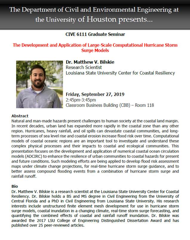 You are invited to attend the Civil & Environmental Engineering CIVE 6111 Graduate Seminar titled The Development and Application of Large-Scale Computational Hurricane Storm Surge Models by Dr. Matthew V. Bilskie, this Friday, September 27, 2019 from 2:30PM-4:00PM. We will serve light refreshments and set-up from 2:30PM-2:45PM. The talk will be held from 2:45PM-3:45PM and will be followed by a brief 15 minute Q&A session. The seminar will be in the Classroom Business Building (CBB) Room 118.