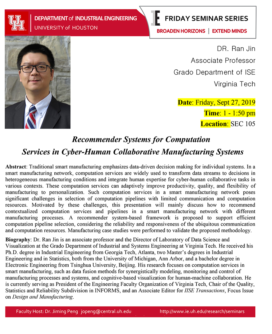 IE Friday Seminar Series: Friday, Sept 27, 2019 - Recommender Systems for Computation Services in Cyber-Human Collaborative Manufacturing Systems