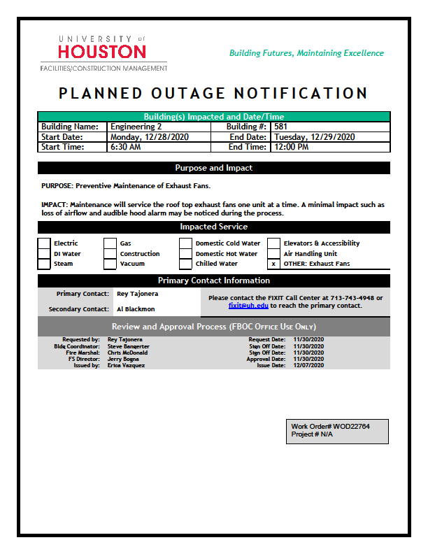 Desc: PLANNED EXHAUST FAN OUTAGE NOTIFICATION-#581 ENGINEERING