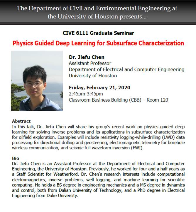 You are invited to attend the Civil & Environmental Engineering CIVE 6111 Graduate Seminar titled Physics Guided Deep Learning for Subsurface Characterization by Dr. Jiefu Chen this Friday, February 21st from 2:30PM-4:00PM. We will serve light refreshments and set-up from 2:30PM-2:45PM. The talk will be held from 2:45PM-3:45PM and will be followed by a brief 15 minute Q&A session. The seminar will be in the Classroom Business Building (CBB) Room 120.