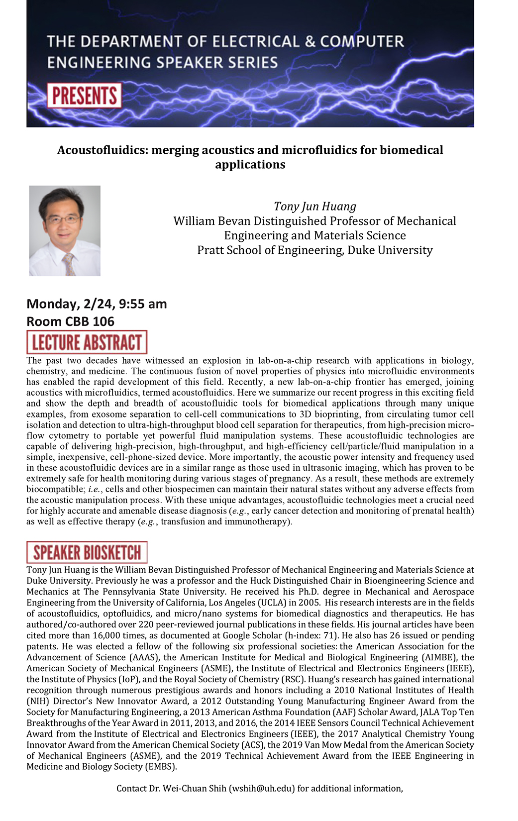 [CCoE Notice] ECE Speaker Series: Acoustofluidics: merging acoustics and microfluidics for biomedical applications 2/24