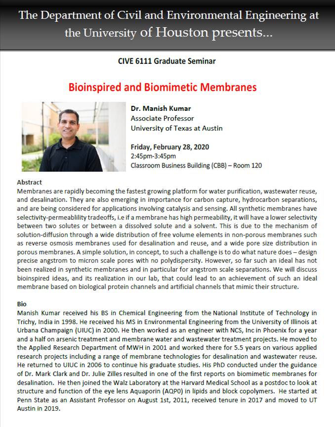 You are invited to attend the Civil & Environmental Engineering CIVE 6111 Graduate Seminar titled Bioinspired and Biomimetic Membranes by Dr. Manish Kumar this Friday, February 28th from 2:30PM-4:00PM. We will serve light refreshments and set-up from 2:30PM-2:45PM. The talk will be held from 2:45PM-3:45PM and will be followed by a brief 15 minute Q&A session. The seminar will be in the Classroom Business Building (CBB) Room 120.