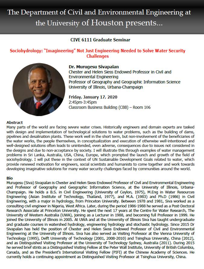 You are invited to attend the Civil & Environmental Engineering CIVE 6111 Graduate Seminar titled Sociohydrology: “Imagineering” Not Just Engineering Needed to Solve Water Security Challenges by Dr. Murugesu Sivapalan this Friday, January 17th from 2:30PM-4:00PM. We will serve light refreshments and set-up from 2:30PM-2:45PM. The talk will be held from 2:45PM-3:45PM and will be followed by a brief 15 minute Q&A session. The seminar will be in the Classroom Business Building (CBB) Room 106.