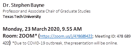 [Dr. Stephen Bayne Professor and Associate Chair of Graduate Studies Texas Tech University Monday, 23 March 2020, 9.55 AM Room: ZOOM* (https://zoom.us/j/478689422; Meeting ID: 478 689 422) *Due to COVID-19 outbreak, the presentation will be online.]<https://zoom.us/j/478689422>[Stephen Bayne]