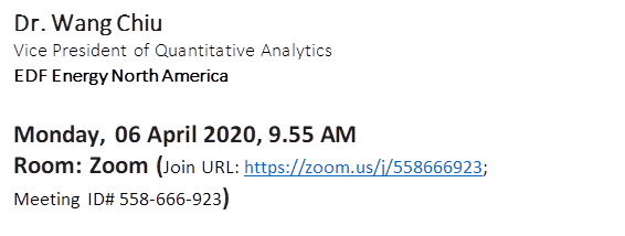 [Dr. Wang Chiu Vice President of Quantitative Analytics EDF Energy North America Monday, 06 April 2020, 9.55 AM Room: Zoom (Join URL: https://zoom.us/j/558666923; Meeting ID# 558-666-923)]<https://zoom.us/j/558666923>[cid:image003.jpg at 01D602DE.4E252220]