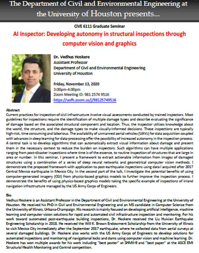 CEE faculty member, Dr. Vedhus Hoskere, will present this week’s CIVE 6111 Graduate Seminar via Zoom (link below). His seminar is titled “AI Inspector: Developing autonomy in structural inspections through computer vision and graphics” and it will be presented on Friday, November 13th from 3:00PM-4:00PM. Please see the attached seminar announcement.