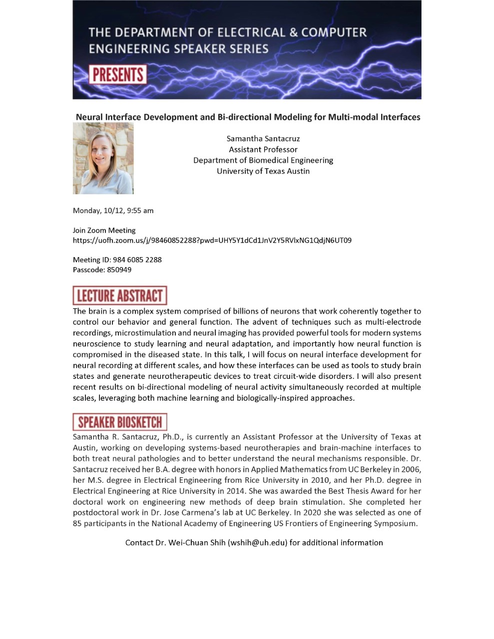 The ECE Speaker Series Presents: Neural Interface Development and Bi-directional Modeling for Multi-modal Interfaces - Monday, 10/12, 9:55 am
