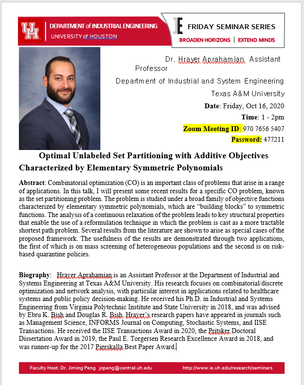 [CCoE Notice] IE Seminar - Friday Oct 16 at 1pm - Optimal Unlabeled Set Partitioning with Additive Objectives Characterized by Elementary Symmetric Polynomials