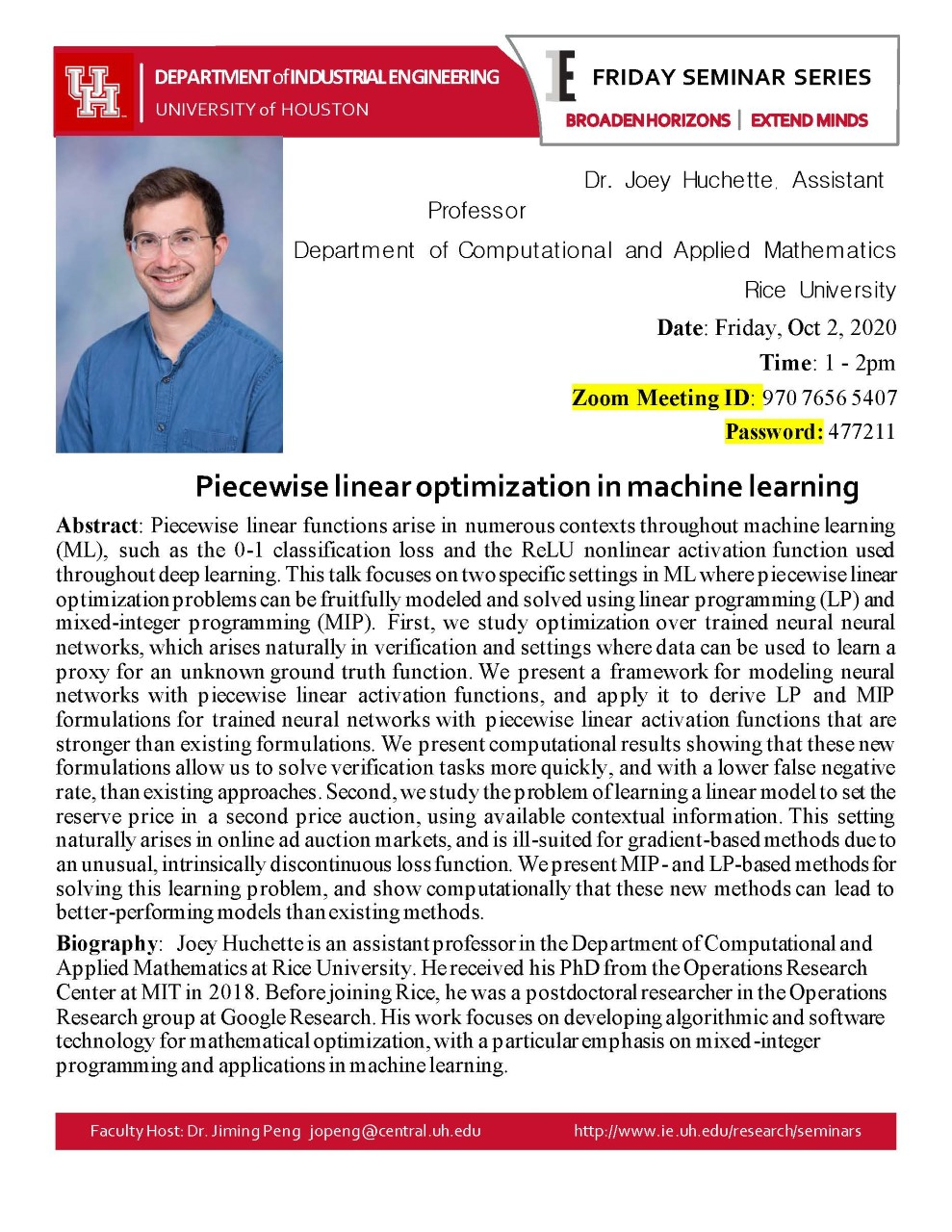 IE Friday Seminar Series - Friday Oct 2 at 1pm - Piecewise linear optimization in machine learning