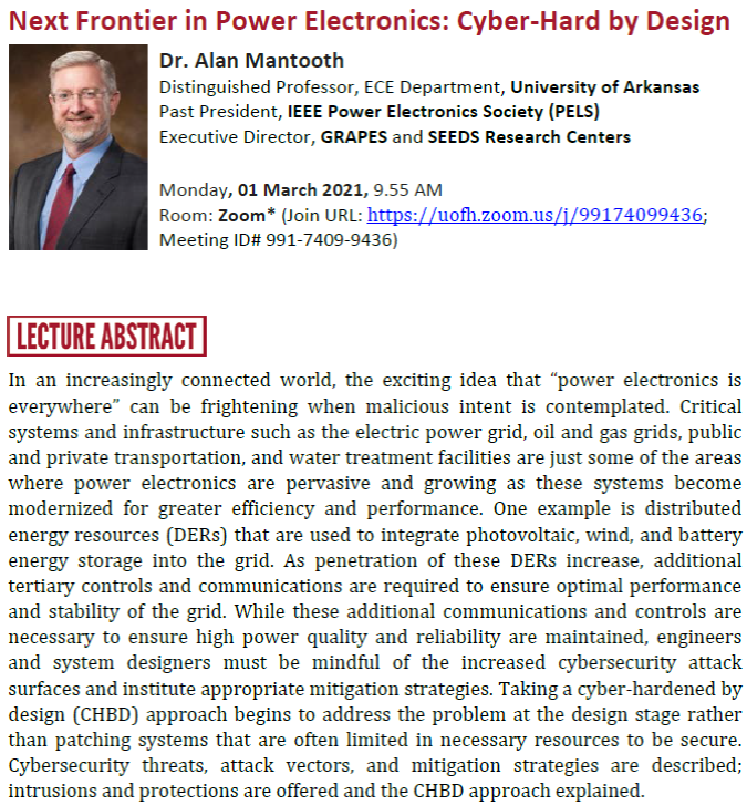 "A Next Frontier in Power Electronics: Cyber-Hard by Design" --> UH ECE Seminar by Prof. Alan Mantooth (U. Ark.) --> Monday, 01 March 2021 at 10 AM, online via ZOOM